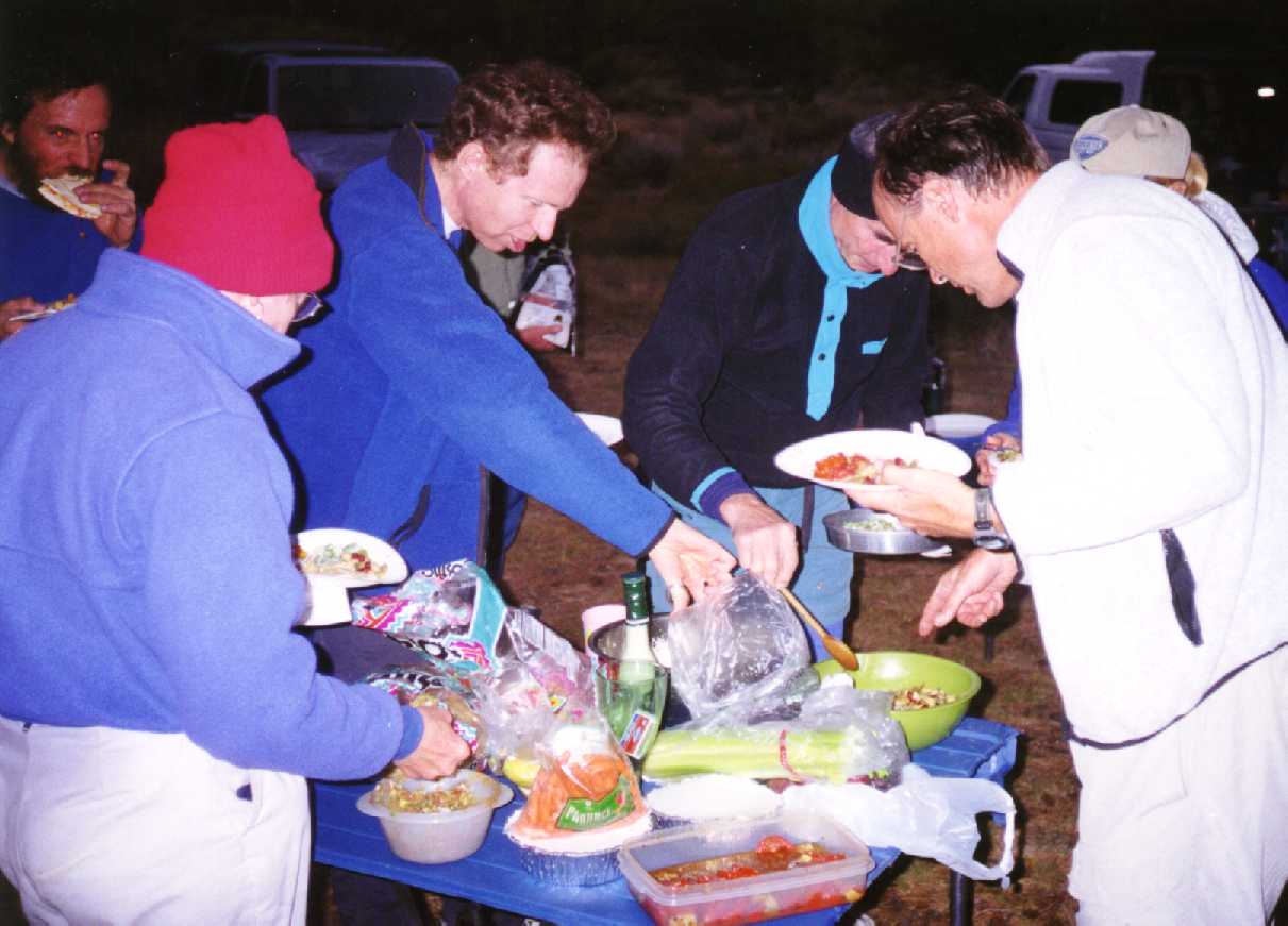 We got back to the cars at Minaret Summit around 4:30. David Underwood helped by driving the rough 4WD road back up the ridge for two miles to pick up one of our group who had a painful heel. Next we made a short drive drive to a nice spot I had selected, in the open "dispersed camping" area about three miles NW of Mammoth Town. It was a great spot for our group, with ample flat area, protected by trees yet still open to the sky, and with existing fire ring and plenty of wood. Those who needed to could make a ten minute detour to town for purchases. The tables we brought were set out and then loaded with the potluck delights for a feast. The scrumptious dishes included quesadillas, sushi, hummus/pita, Caesar and bean salads, couscous, wok chicken and veggies, BBQ chicken, and great cakes and cookies for dessert.