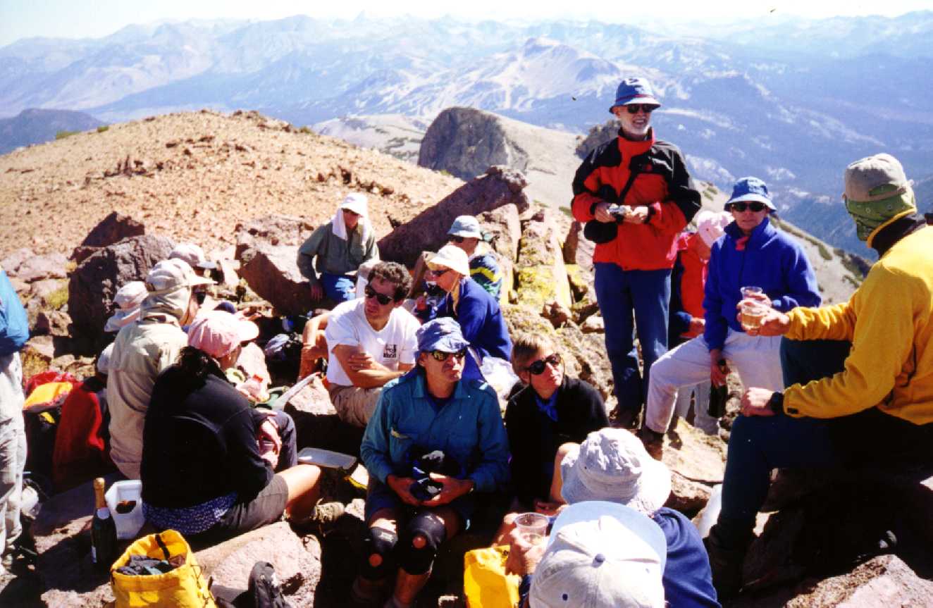 At that spot I contemplated the significance of the moment, the realization of a multi-decade goal, completing the ever-sacred list of the 247 most significant peaks in the Sierra Nevada of California. I tried to relate my final hurdle of the mere 50 feet remaining to the hundreds of thousands of vertical feet and thousand-odd miles traveled in the 40 years I had been climbing Sierra peaks. I approached slowly, and as I finally stood at the summit I yelled out to the visual feast all around in celebration. In tradition, we hugged, kissed, photographed, shook hands, drank champagne, and ate goodies.
