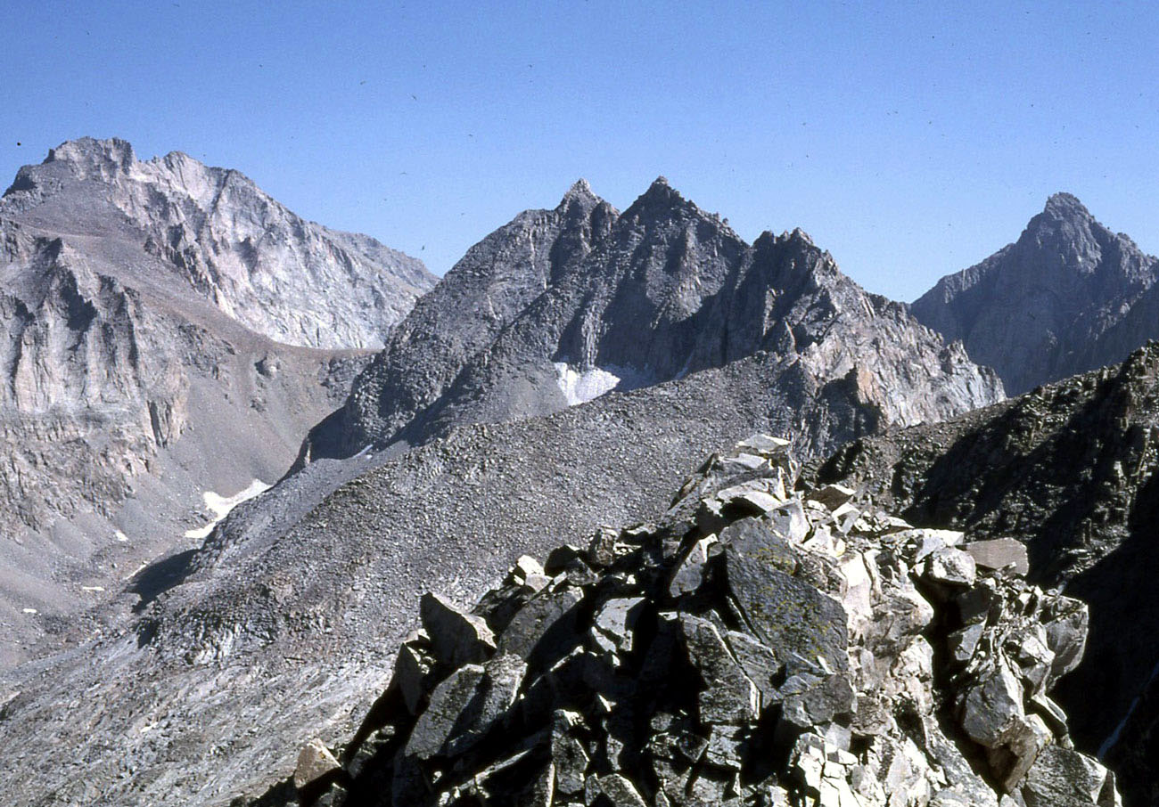 Sixth Day, University Pass or Secor's Wrong Pass: By the sixth day I was very mellow and content with only having climbed two peaks, which considering my recent medical problems was great. The only remaining peak to climb was University and we thought that we could climb it from the pass. In Secor's second edition he omits any description of an approach from the west and only shows a picture of University Pass (on page 144) that he labels as the first saddle to the right or south of the peak. But what you can't see from the picture since it's hidden behind Center Peak is that the real University Pass is next to Peak 3926 (12,877'). Both the pass and Peak 3926 seem to be labeled wrong in Secor's book!