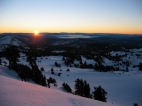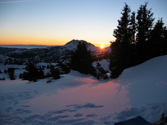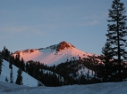We left the Chalet around 8am on foot initially and later on snowhoes and skis. We followed the road the whole way to Helen Lake. We did not take the Diamond peak cut off on the way up. We snowshoed / skied past Helen Lake and continued to the point where the road reaches a saddle. Lassen SW ridge starts just above the saddle. From this point, we headed a up a steep slope toward the ridge to reach a bench about 300 feet above the saddle. This bench offers some protected camping spots and put us in the best position to climb up the ridge the next morning. In addition, the bench offers very open views with morning and evening sun. It took us 7 hours to reach this spot after a fairly slow climb up the road.