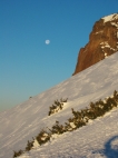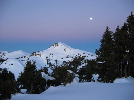 Moon setting as the sun is rising, looking over the shoulder of Lassen: