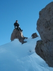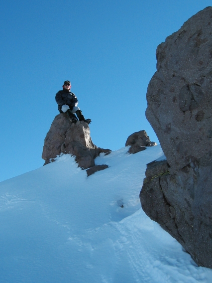 We started from camp with crampons at 7am on Sunday morning. Following the ridge, we reached the summit at 9am, achieving 1000 feet/hour. There was only moderate wind at the summit considering we were there in January. Three of us glissaded down the bowl. The snow had softened and although it started steep, the glissade ended in a very gradual flat run. The glissaders were back to camp at 10:30am. The rest of the group who hiked down the ridge reported bad cases of balling crampons, due to the softer snow and arrived at camp around 11am..