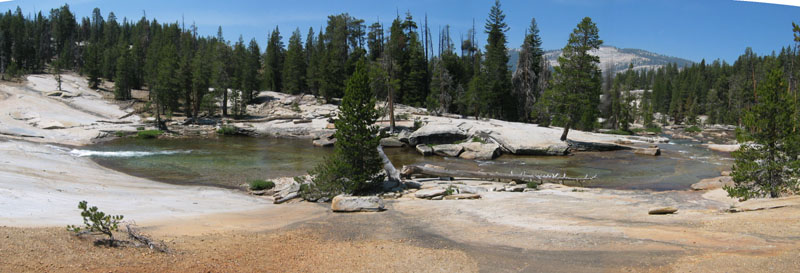 The hike up the North Fork of the Kings River was more scenic than some of us expected. Great slabs and pools around Big Maxon Meadow, a fair amount of shade from tall trees, and not too many switchbacks. Our camp at Portal Lake (10300') was gorgeous! A few bugs, a light breeze, a good sunset, and flat granite slabs for cooking and camping.