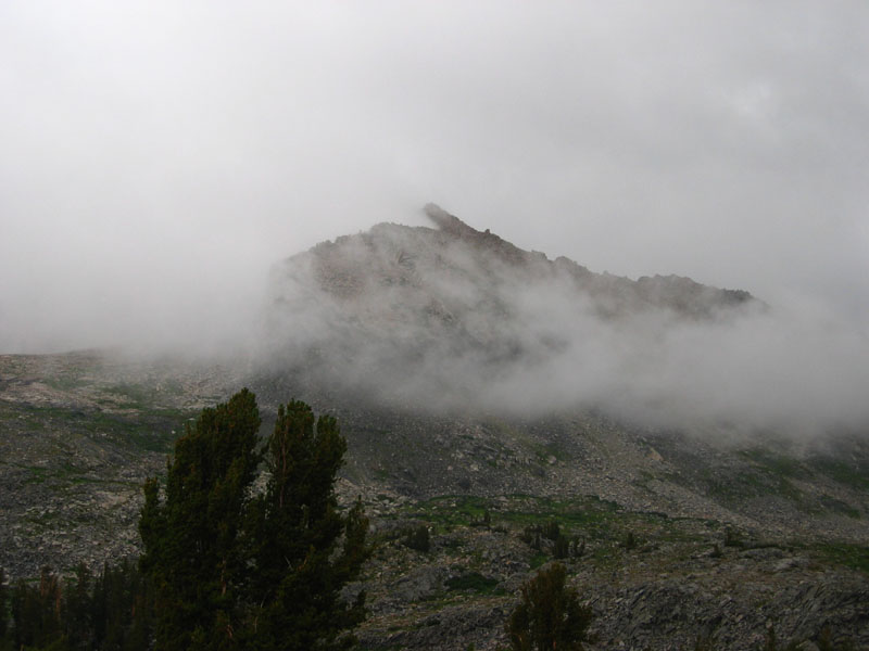Our camp (at 10.8k, west of Lake 10232) was referred to as something from a Lord of the Rings set. We got there just as Tuesday's storm started to dump, and put up tents in a drizzle that became a steady rain. Once again it cleared for dinner, but overnight the fog and dew were as heavy as I've ever seen it in the Sierra.