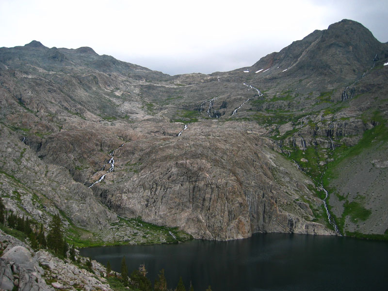 The west side of the pass is easy walking but looks improbable as you wind your way down very steep slabs on very reasonable ledges. We went more or less down the center, but I think there's another option on the south side of the drainage.