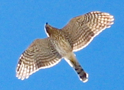 | NOTE: There has been much post-trip-report disagreement about what bird this actually was. Is it a Peregrine Falcon or a Cooper's Hawk? One reader spent some time banding birds and is sure it's a juvenile Cooper's Hawk. The person on the mountain with me who originally identified it as a Peregrine Falcon saw things you can't see in the picture: "deep and very fast wingbeats that distinguish the Peregrine from the Coopers" and "distinctive black helmet with the sidecut". I didn't see the helmet, and the throat coloring seems more like the hawk pictures I've looked up, but hey, what do I know? I know The Canadian Peregrine Foundation has a Cooper's Hawk ID Page and a Peregrine Falcon ID Page where you can clearly see the helmet and the coloring, but wing shape isn't so obvious. Happy researching! |