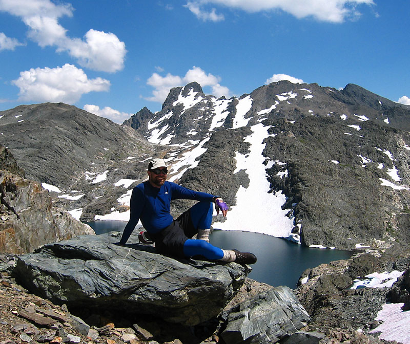 In no time we were scrambling across the notch to the (10 feet) higher northeast summit. We marveled at the precipitous northwest face, the many lakes, the many butterflies, and the warm wind-free conditions. About an hour and a half went by before we could tear ourselves away. I guess I'm getting old, but lounging on a peak now seems more appealing than trying to run across the basin and bag a second one.