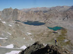 We retraced our steps down Starr's Route. Rick decided to bail off the class 2 route from the ridge on the lower half while Jeff and I continued down the class 3 to the toe where we'd started in the morning. Coming upon the bit of class 4 we'd taken in the morning, we found a more reasonable way around that stretch. A short distance ahead of the others during the descent, I heard voices wafting up from below. When I could get a clear view down to the basin, I could see a party of four resting on the grassy slopes of the Davis Lakes Basin, not far from the toe. Once back down the route I recrossed the moat (getting more pics of Jeff who'd caught up by now), then across the snow and down the slopes to those below. We stopped to chat with them, finding that they had camped near Wanda Lake and come up for an attempt at Goddard. They said they had climbed half of the route before turning around, unable to find a class 2 continuation. The exit ramp seemed to be the key piece they had missed. They were of course surprised to find out we were dayhiking the peak, one their party asking three times where we were camped because he kept thinking he misheard us. Upon leaving them, they called out for one last question, "One of you wouldn't happen to be Bob, would you?" We laughed, particularly after he mentioned the Wall Street Journal article. "You read that?" I asked incredulously. It had been printed only four days earlier, and here was a guy we ran into far into the backcountry who reads the Wall Street Journal. They seemed excited to actually see me in the flesh, raising their hands in cheer. And so we left them.
