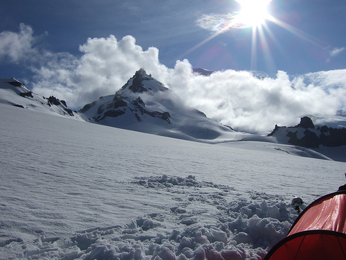 Nine of us started out from Fryingpan Creek trailhead at 3900' towards Summerland. The trail is wide and in good shape, but large parts are still covered in snow. After about four miles we crossed Fryingpan creek itself and broke away from the trail, instead heading for Meaney crest, where we had planned on spending the night, at around 7500'. We wound up hiking even higher, onto the lower, uncrevassed reaches of Fryingpan glacier, finding a suitable camping spot at 7900' around 3pm. Setting up camp and melting snow for water took until 8, and in that time we watched the weather deteriorate from a nice, sunny day to rain, then hail/snow, and finally a whiteout. Fortunately, the wind never got to be too bad.