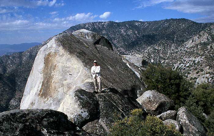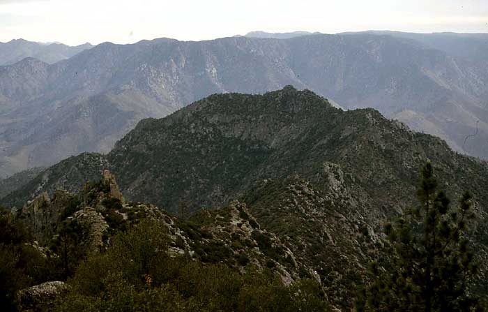 Photo 2: Steve on the ridge 0.3 mi. from the summit in full bushwhack attire...quite different from his normal clothing choice for climbing. The NW ridge is in the extreme right-hand corner of the photo, with the terminus of the Kern Plateau behind it. Just to the left of the NW ridge, the gully we used on our return can be seen ascending towards the top of the Kern Plateau.