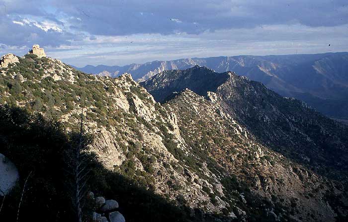 Other useful factoids: Round trip distance was about 7 miles with total hiking time of 11 hrs 15 min, and 4300 feet of total elevation gain, most of it on the way back to camp. Although the map indicated about 3100 feet of gain, we got lots of bonus gain by constantly moving up and down across the terrain to avoid dense sections of brush. We easily kept the climbing difficulties to class 2 with occasional class 3 moves along the ridge. It got quite warm here even at the end of October with overcast skies most of the day. With the heat and the energy-sapping bushwhacking activities, I went through nearly all my food and found that 3 quarts of water was not enough for the hike. And did I mention that nearly all the brush we waded through had pointy needles and spines? There was an over-abundance of holly-like bushes with prickly leaves, and Yucca-type plants with spikes. Bring full-body armor for skin protection, including gloves for when you get tripped-up by the brush. Nearby Bartolas Creek was dry, so bring all the water you need especially if hiking this route mid- to late-season.