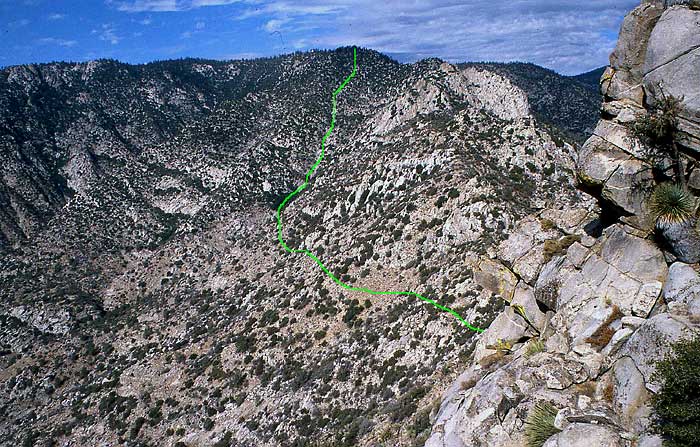 Photo 3: Our return route is shown marked on the photo. The marked line begins roughly at the low point on the NW ridge and ends at the top of the Kern Plateau.