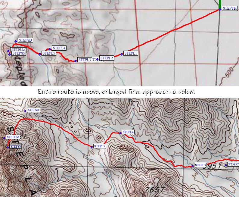 Instead of walking down the road on foot, we struck off at a GPS bearing. The terrain is open and easy to walk. There's no reason to walk the square cornered route they suggest if you have a GPS or if you're a good navigator - just head for the mouth of the canyon. (If you're worried about getting lost, walking straight east to the closed road and following it to your car is safer.) We adjusted our route a bit on the way out, and decided skirting relatively high on the alluvial fan was the best (waypoint STEPL1). Stay above (north of) Point 595 (meters) on great footing, and drop into the main wash around waypoint STEPL3 to avoid steep ravines coming in from the north.