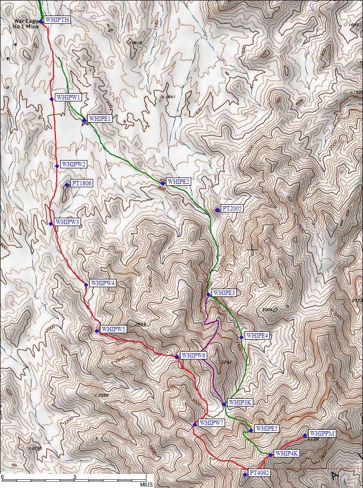 From the mine we stayed just right of low bumps in a broad wash. So broad that we were never really sure if we were in the right place. It was often easier to walk above the edge of a channel than to be down in the brush-and-sand bottoms. Around the saddle at waypoint WHIPE2 we were sidhilling to avoid the narrow strip of brush that passed for a drainage. The route drops into another drainage here, passing west of Point 2005 and entering a deep canyon. WATCH OUT for branches. We missed the one at WHIPE3, going straight instead of turning left because our branch looked better. It was fun, but it ended at a chockstone. We climbed out to the left on class 2-3, ending up on the north ridge of Point 3292. Oops. From there it was an easy traverse back around to the 3000' saddle (waypoint WHIP3K) which was on the western route. Our little excursion is the purple line, but I wouldn't recommend it.